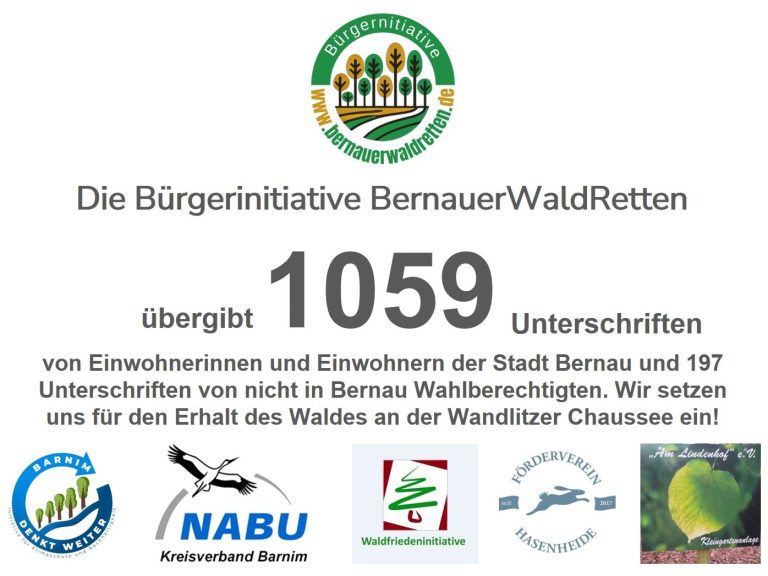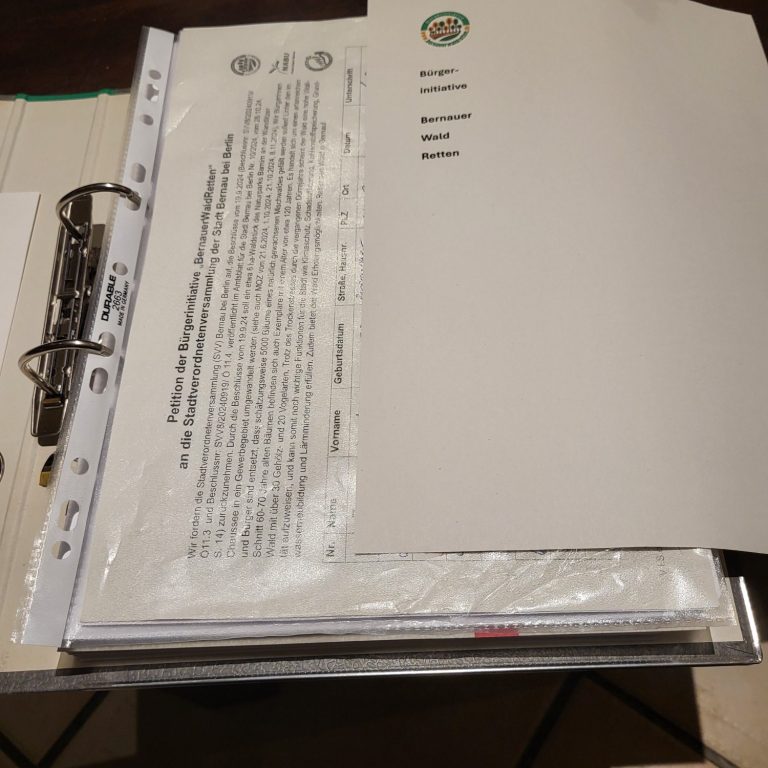Für viele Bernauerinnen und Bernauer zeugen diese SVV-Beschlüsse von einer erschreckenden Ignoranz gegenüber dem Interesse und Bedarf an einer gesunden Natur und Umwelt sowie Klima- und Lärmschutz für unsere Stadt. Um die Rodung dieses Waldes zu verhindern und das Waldstück langfristig zu sichern, hat sich die Bürgerinitiative „BernauerWaldRetten" gegründet. Die Gründungsversammlung fand am 28.11.24 in Bernau statt. Die Bürgerinitiative prüft die Maßnahmen zum Schutz des Waldes, übergab am 17.12.2024 die Petitionslisten an die Stadt Bernau gegen die Waldrodung und wurde am 30.1.2025 in der SVV Bernau angehört (hier ist die Rede zum nachlesen).