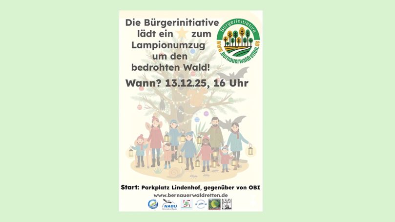 die Bürgerinitiative BernauerWaldRetten bedankt sich für die Teilnahme am Lampionumzug um den bedrohten Wald am 13.12.25, siehe Artikel hierzu den Artikel in der MOZ vom 16.12.25 ("Wald in Bernau: Protest gegen Gewerbegebiet, Bürgerinitiative droht mit Klage").